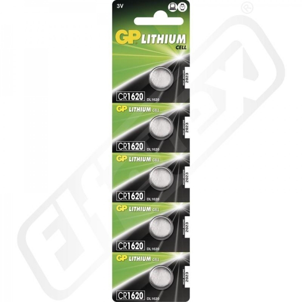 GP CR1620 (CR1620), 3V jmenovitá kapacita: 75 mAh (při zátěži 30 kOhm) rozměry: průměr 16,0 x 2,0 mm prodejní obal: 5 ks, blistr GPBAT. KNOF. CR1620 5BL