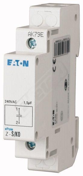Blok kondenzátorů (kompenzátor), 1,5 µF, 240V AC, vestavný rozměr víčka 45 mm, šířka při montáži 1HP (17,5 mm), montáž na montážní lištu