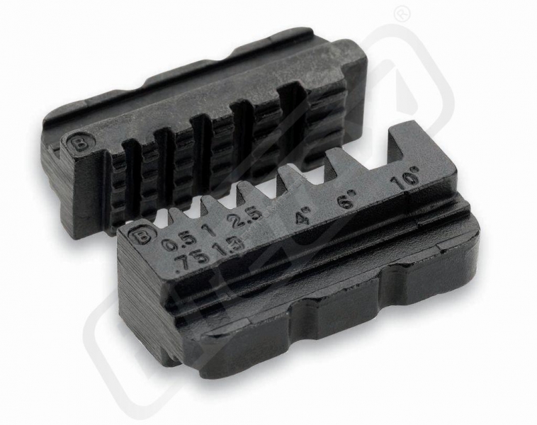 Presszangensystem Click´n´Crimp, neuartiges, patentiertes Presswerkzeugsystem für alle gängigen Presszange mit 3 auswechselbaren Pressprofileinsätzen, die durch eine Rasthalterung im Zangenkörper fixiert werden; dadurch sekundenschneller Profilwechsel ohne Zuhilfenahme weiteren Werkzeugs. Die beiden aktuell nicht im Einsatz stehenden Pressprofileinsätze werden in den beiden in die Zangenschenkel integrierten Magazinhaltern unverlierbar aufbewahrt. Mit CLICK´N´CRIMP werden gegenüber anderen Systempresszangen bzw. Einzelwerkzeugen Zeit, Platz, Gewicht und Kosten gespart. Zangenkörper aus 3 mm starkem, spezial vergütetem, gehärtetem Stahlblech, mit Hebelübersetzung für geringen Handkraftaufwand, stellbare Ratschenmechanik mit Zwangsentriegelung für normgerechten Pressdruck, ergonomische 2-Komponenten-Griffhüllen, komplett bestückt mit gehärteten präzisen Pressprofileinsätzen jeweils für isolierte Kabelschuhe rot blau gelb (0,5 mm2 bis 6 mm2), isolierte und nicht isolierte Aderendhülsen 0,5-10qmm, nicht isolierte Kabelschuhe 0,5-10qmm, Gewicht inkl. 3 Pressprofileinsätze nur 690 g. Ersatzprofil für Aderendhülsen 0,5-10qmm (Trapezpressung)