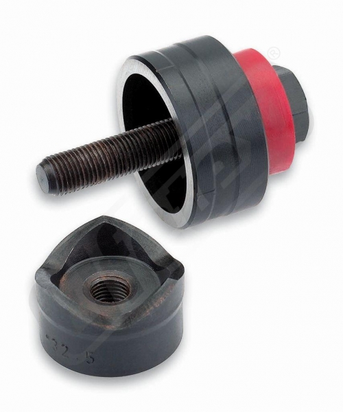 Schraublocher Rund BASIC geeignet für: Stahlblech (ST 37), Kunststoff und Aluminium. Betätigung: Manuell und hydraulisch Ausführung: Mit Stempel, Matrize und Kugellager-Zugschraube (gekapselt): Nennmaß 25, Loch 25,4 mm Durchmesser , Schraubengröße 9,5 x 50,0 mm, Vorbohr 11,0 mm Durchmesser, max. Materialstärke 2,0 mm