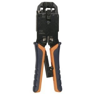 Kleště lisovací 4/6/8 celokovové s račnou pro konektory 4/4 , 6/6, 8/8 Modré měkčené rukojeti s vestavěným striperem na kulatý kabel.