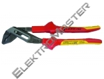 Mit zweifarbigen, ergonomischen Kunststoff-Griffhüllen in moderner 2-Komponenten- Technologie: Gute Griffigkeit durch rutschfeste, nicht klebende Oberfläche auch bei Nässe und Schmutz, Isolierung bei extremen Temperaturen, elektrischen Schlägen und Vibrationen sowie Beständigkeit gegen Schweiß, Salzwasser,Öl und viele Chemikalien. Wasserpumpenzange DIN ISO 8976, aus Chrom-Vanadium-Stahl, mitBrennerloch und Doppelrillen-Gleitgelenk, 5fach verstellba, 1000V, 250mm lang