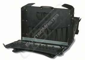 Werkzeugkoffer aus starkem Rindleder mit verzinkter, vernieteter Blechbodenwanne, abklappbare Vorderwand, Vorder- und Rückwand, Boden, Deckel und Seitenteile extra verstärkt, schwerer Tragegriff, 2 abschließbare Schlösser, seitliche Steckschlösser, Bodengleiter, seitliche Schlaufen für Schultertrageriemen, Innenseiten mit zahlreichen Werkzeugeinsteckfächern und verstellbaren Schlaufen, zusätzlich alle Außenkanten mit Alu-Winkeln verstärkt, zusätzlich mit abklappbarer Rückwand, herausnehmbarer Zwischenwand und Dokumenten-Vortasche