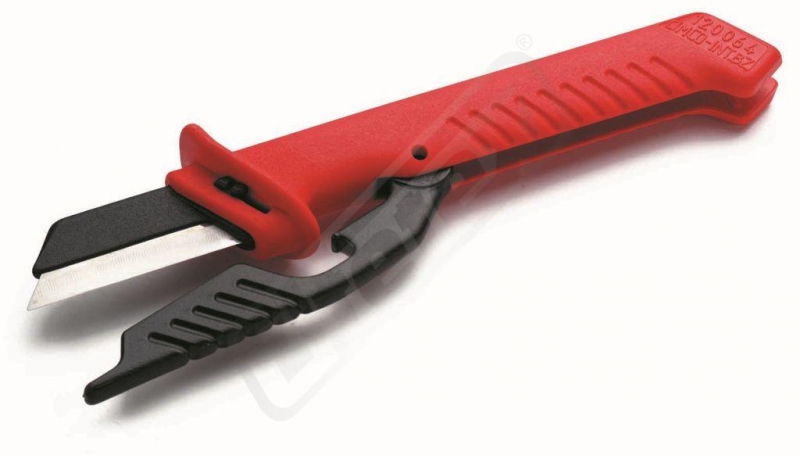 Sicherheits-Kabelmesser mit isoliertem Klingenrücken und abklappbarem, im Schaft versenkbarem Klingenschutz, mit auswechselbarer Klinge