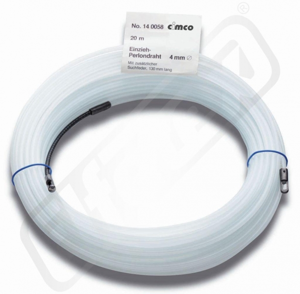 Einzieh-Perlondraht aus verstrecktem Monofil, mit massiven Stahl-Endstücken und zusätzlicher Suchfeder, ca. 130 mm lang, Zugösen beidseitig, Material? 4 mm, Zugfestigkeit 900 N, Größe 30m.