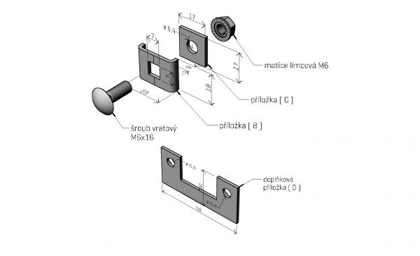 | Spojka SZM 4 se používá k vytváření kolen, T-kusů, křížení žlabůa dalších různých odbočení dle potřeby na kabelové trase. Kombinacípříložek C nebo D lze docílit různého úhlu postupného oblouku trasy.Sada spojky se skládá z hlavní příložky typu B, příložek typu Ca D, šroubu vratového M6x16 a matice límcové M6. Komponenty na tomto obrázku jsou součástí balení. Balení 10x10ks. V sáčku je vždy 5ks doplňková příložka, která se instaluje s 2x spojkou SZM 4. |