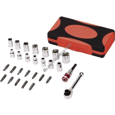 | Bit- und Steckschlüsselsortiment, 28-teilig, in ansprechend kompakter zweifarbiger Kunststoffbox, Steckschlüssel und Antriebsratsche aus Chrom-Vanadium-Stahl, spezialgehärtet, hochglänzend poliert und hartverchromt, Inhalt: je 1 Stück, Zwölfkant-Steckschlüsseleinsätze mit 1/4 Zoll-Vierkantantrieb: 4 4,5-5-5,5-6-7-8-9-10-11-12-13-14mm, Mini-Ratsche mit Umschalter und Quick-Release- 1/4 Zoll-Vierkantantrieb, Schraubbits aus S2-Spezialstahl, 25 mm lang; je ein Bit, für Schlitzschrauben 4-5-6mm, für Kreuzschlitzschrauben PHILLIPS PH1-PH2-PH3, für Kreuzschlitzschrauben Pozidriv PZ1-PZ2-PZ3, für Innensechskant-(Inbus-)Schrauben 4-5-6mm, Bithalter mit Schnellverschluss, 55 mm lang, für Hand- und Maschinenbetrieb, Adapter von 1/4 Zoll-Vierkantantrieb (z. B. für Ratsche) zu 1/4 Zoll-Sechskantantrieb (z. B. für Schraubbits), 25 mm lang |