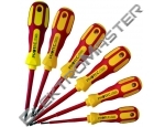 | 6 dílná sada VDE bezpečnostních šroubováků; Materiál: tvrzená ocel chrom-vanadium, s precizním hrotem; Vícekomponentní rukojeť (tvrdé i měkké zóny), integrovaná závěsná dírka; Nejvyšší ochrana pro všechny druhy práce pod napětím až do 1000 V AC resp. 1500 V DC; Zkoušeno dle EN 60900 (IEC 900) pod zkušebním napětím 10.000 voltů ve vodní lázni; Obsahuje: 4 ploché šroubováky 2,5 / 3,5 / 4,0 a 5,5; 2 křížové šroubováky Phillips PH 1 a PH 2 |