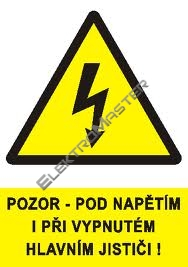 | Tabulka samolepící "Pozor - pod napětím i při vypnutém hlavním jističi!" velikost 5x1,6cm |
