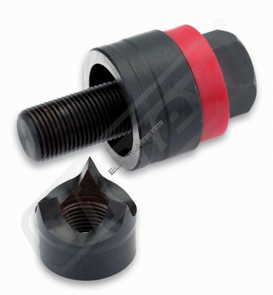 Schraublocher DIAMANT Innovativer Spalt-Stempel mit drei Schneidspitzen: Stanzabfall wird in drei Teile gespalten.Geeignet für: Stahlblech (ST 37), Kunststoff und Aluminium. Betätigung: Manuell und hydraulisch geeignet für: Stahlblech (ST 37), Kunststoff und Aluminium. Betätigung: Manuell und hydraulisch Ausführung: Mit Stempel, Matrize und Kugellager-Zugschraube (gekapselt) : Nennmaß 25; Loch 25,4 mm Durchmesser; Schraubengröße 9,5 x 50,0 mm ; Vorbohr 10,0 mm Durchmesser; max. Materialstärke 2,0 mm