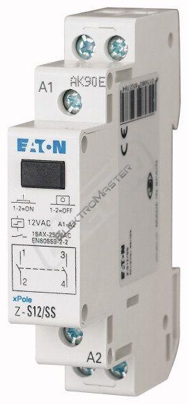 Impulsní relé, řídicí napětí 12V 50Hz, funkce: 2 spínací kontakt, jmenovitý povozní proud při 250V AC podle IEC/EN 60669-2-2: 16A, vestavný rozměr víčka 45 mm, šířka při montáži 1HP (17,5 mm), montáž na montážní lištu, průřez svorky 0,5–10 mm? jednodrátový a vícedrátový / 0x5–6 mm? lankový s dutinkou