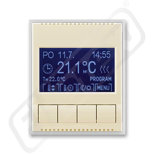 | Element# | Termostaty | Termostat univerzální programovatelný - ovládací část | slonová kost / ledová bílá || Ovládací jednotka (nutno použít spínací přístroj). Volitelná funkce prostorového, podlahového nebo kombinovaného termostatu. Nastavitelné teploty: 0 °C až +50 °C. Provozní režimy: manuální, automatický (1 základní nebo 3 rozšířené časové programy), dovolená. Základní program: volba ze2 přednastavených teplot - komfortní a útlumové. Rozšířený program: navíc možnost libovolně nastavitelné teploty. Časový program: max. 70 časových značek s rozlišením 5 minut, pro jednotlivé dny v týdnu nebo Po-Pá, So-Ne, Po-Ne. Další funkce: softwarové vypnutí, volba topení nebo chlazení, jas a kontrast displeje, zámek tlačítek, volba teplotního snímače, minimální a maximální limitní teplota, vnější ovládání kontaktem, adaptivní regulace, funkce předvídání, omezení nastavitelných teplot, počítadlo provozních hodin, protimrazová ochrana, ochrana ventilů, inverze funkce výstupu, automatický přechod zimní/letní čas, volba jazyka (CZ, EN, RUS). Rezerva chodu: cca 90 dní (dobíjecí Li článek). Pracovní teplota: 0 °C až +50 °C. Snímač teploty pro podlahové vytápění: 3292U-A90100 (není vdodávce) |