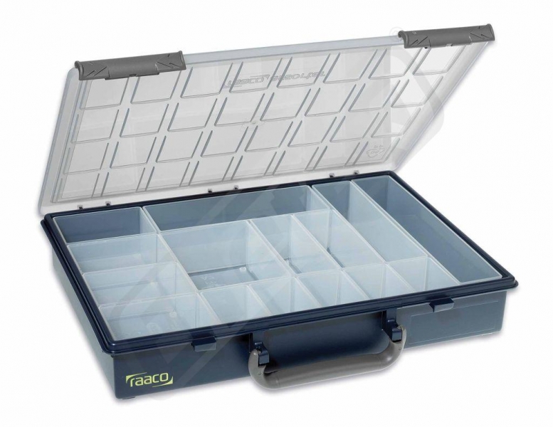 Sortimentskästen PSC preiswerte Transport- und Aufbewahrungskoffer für Kleinteile, mit fester, variabler oder ohne Inneneinteilung,aus widerstandsfähigem Polypropylen, stabile Schiebeverschlüsse mit Rastung, Kofferdeckel Deckel mit U-Profilen für verrutschsichere Aufbewahrung von Lagergut und loser Einsatzfach, stapelbar, auch hochkant aufzustellen, Farbe anthrazit - blau transparent, PSC vario Sortimentskästen mit variabler Inneneinteilung durch Einsatz von Einsätzen der Carry-Lite 55-Serie (Rastereinteilung 8 längs x 4 breit). Mit ergonomischem Tragegriff (nicht PSC vario-240), Typ vario-15, Kleingefache 15, 0,90kg, 340x260x57mm.
