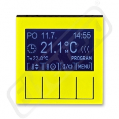 Levit# | Termostaty | Termostat univerzální programovatelný - ovládací část | žlutá / kouřová černá || Ovládací jednotka (nutno použít spínací přístroj). Volitelná funkce prostorového, podlahového nebo kombinovaného termostatu. Nastavitelné teploty: 0 °C až +50 °C. Provozní režimy: manuální, automatický (1 základní nebo 3 rozšířené časové programy), dovolená. Základní program: volba ze 2 přednastavených teplot - komfortní a útlumové. Rozšířený program: navíc možnost libovolně nastavitelné teploty. Časový program: max. 70 časových značek s rozlišením 5 minut, pro jednotlivé dny v týdnu nebo Po-Pá, So-Ne, Po-Ne. Další funkce: softwarové vypnutí, volba topení nebo chlazení, jas a kontrast displeje, zámek tlačítek, volba teplotního snímače, minimální a maximální limitní teplota, vnější ovládání kontaktem, adaptivní regulace, funkce předvídání, omezení nastavitelných teplot, počítadlo provozních hodin, protimrazováochrana, ochrana ventilů, inverze funkce výstupu, automatický přechod zimní/letní čas, volba jazyka (CZ, EN, RUS). Rezerva chodu: cca 90 dní (dobíjecí Li článek). Pracovní teplota: 0 °C až +50 °C. Snímač teploty pro podlahové vytápění: 3292U-A90100 (není v dodávce)