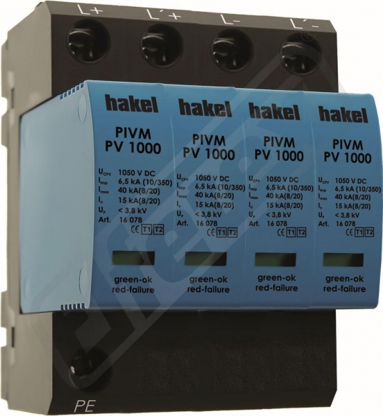 | PIVM PV je svodič přepětí typu 1+2 podle normy EN 61643-11, EN 50539-11 a UTE C 61-740-51.Označení M # specifikuje konstrukční provedení s výměnným modulem. Instaluje se na rozhraní LPZ 0 #2 (podle IEC 1312-1 a EN 62305), kde zajišťuje vyrovnávání potenciálů plusových a mínusových sběrnic fotovoltaických systémů a likvidaci transientních přepětí vznikajících při atmosférických výbojích nebo spínacích procesech. Jednotlivé varistorové sekce zapojené mezi svorky L+, L- a PE jsou opatřeny interními odpojovači, které jsou aktivovány při poruše (přehřátí) varistorů. Indikace provozního stavu těchto odpojovačů je jednak vizuální (změnou barvy signalizačníhopole), jednak dálková pomocí bezpotenciálových přepínacích kontaktů (pouze u typu DS). |
