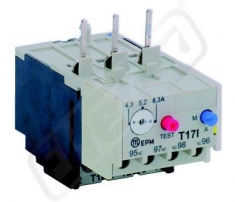 | "Nepřímá primární tepelná nadproudová relé T17, T50 a T63 ve spojení selektromagnetickými stykači jsou určena k jištěnítrojfázových indukčních elektromotorů nn proti přetížení. Vyrábějí sepro jmenovité proudy od 0,1 do 80 A.Relé T17 je určeno pro přímou montáž na stykač C9. , C12. , C17. ,C23. , C16. , C20. , C25. , C32. , C40. .K samostatné montáži je třeba použít adaptéru H17." |