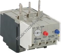 | "Nepřímá primární tepelná nadproudová relé T17, T50 a T63 ve spojení selektromagnetickými stykači jsou určena k jištěnítrojfázových indukčních elektromotorů nn proti přetížení. Vyrábějí sepro jmenovité proudy od 0,1 do 80 A.Relé T17 je určeno pro přímou montáž na stykač C9. , C12. , C17. ,C23. , C16. , C20. , C25. , C32. , C40. .K samostatné montáži je třeba použít adaptéru H17." |