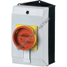 | Hlavní spínač/vypínač podle IEC/EN 60947-3, 690V/100A, stupeň krytí vpředu IP65, rukojeť červená s blokovacím věncem žlutým, uzamykatelná s 3 visacími zámky, konstrukce zátěžových vypínačů P3 je velmi kompaktní a robustní. Ruční pohon působí na kontakty v přímém spojení. Při vypnutí se kontakty nuceně otevřou. Konstrukční formy všeobecně: Skříňky pro povrchovou montáž z izolačního materiálu, montáž, základní montáž, montáž do rozváděče IVS |