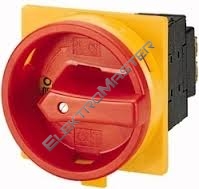 | Hlavní spínač/vypínač podle IEC/EN 60947-3, 690V/63A, stupeň krytí vpředu IP65, rukojeť červená s blokovacím věncem žlutým, uzamykatelná s 3 visacími zámky, konstrukce zátěžových vypínačů P3 je velmi kompaktní a robustní. Ruční pohon působí na kontakty v přímém spojení. Při vypnutí se kontakty nuceně otevřou. Konstrukční formy všeobecně: Skříňky pro povrchovou montáž z izolačního materiálu, montáž, základní montáž, montáž do rozváděče IVS