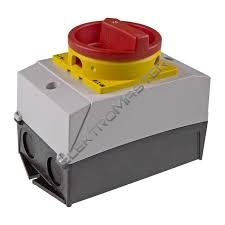 | Hlavní spínač podle IEC/EN60947, konstrukční velikost T0, ve skříňce pro povrchovou montáž, stupeň krytí IP65 s červenou ovládací pákou a žlutým blokovacím věncem uzamykatelné v nulové poloze, jmenovitý trvalý proud Iu 20 A, jmenovité provozní napětí Ue 690V, příslušenství k dodání podle údajů v katalogu Vačkové spínače T. Konstrukční formy všeobecně: skříňky pro povrchovou montáž z izolačního materiálu, montáž, centrální upevnění, základní montáž, montáž do rozváděče IVS