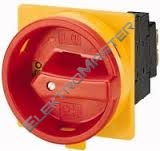 | Vestavný hlavní vypínač podle normy IEC/EN60947, konstrukční velikost T0, tvar při montáži, stupeň krytí vpředu IP65 s červenou ovládací pákou a žlutým blokovacím věncem uzamykatelné v nulové poloze, jmenovitý trvalý proud Iu 20 A, jmenovité provozní napětí Ue 690V, příslušenství k dodání podle údajů v katalogu Vačkové spínače T. Konstrukční formy všeobecně: skříňky pro povrchovou montáž z izolačního materiálu, montáž, centrální upevnění, základní montáž, montáž do rozváděče IVS