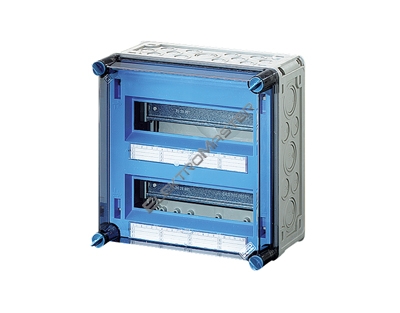 | Nízkonapetový rozvádec zapouzdrený izolacním materiálem jako skrínový systém, "typove zkoušená kombinace rozvádecu" TSK podle IEC 60 439 -1 k montáži na stenu. Skríne musí být vhodné k montáži do venkovního prostredí, je treba respektovat klimatické vlivy a dopady na provozní prostredky. Spodní cásti a víko skríne z odolného polykarbonátu, bez halogenu a silikonu barva RAL 7032, víko pruhledné s rychlouzávery pro ovládání nástrojem. Požární odolnost podle DIN VDE 0471 cást 2 zkouška žhavou smyckou 960°C. Maximální absorpce vody 10 mg podle DIN 53473. Ochranné opatrení: S ochrannou izolací (trída ochrany II). Výrobek: HENSEL Mi-rozvadec. Jisticová skrín 24 modulových jednotek s PE- a N-Svorky. krytí: IP 65 podle IEC 60 529 |