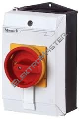 | Hlavní spínač/vypínač podle IEC/EN 60947-3, 690V/63A, stupeň krytí vpředu IP65, rukojeť červená s blokovacím věncem žlutým, uzamykatelná s 3 visacími zámky, konstrukce zátěžových vypínačů P3 je velmi kompaktní a robustní. Ruční pohon působí na kontakty v přímém spojení. Při vypnutí se kontakty nuceně otevřou. Konstrukční formy všeobecně: Skříňky pro povrchovou montáž z izolačního materiálu, montáž, základní montáž, montáž do rozváděče IVS