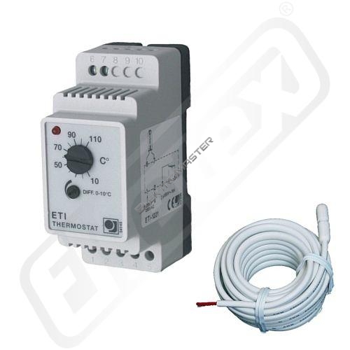 teplotní rozsah -10...+50°C,nastavitelná diference 0,3...6K, výstup: 10A, bezpotenciálový kontakt,včetně kabelového teplotního senzoru ETF-144/99