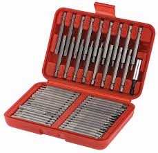 Bit Set - 50-teiliges Sortiment Lange-Sicherheits-Bits  für Arbeiten an Schrauben aller Art, insb. Sicherheits- und Spezialschrauben, dank Überlänge von 75 mm hervorragend geeignet auch an wenig zugänglichen Stellen bei beengten Platzverhältnissen, mit Standard-Sechskant-Aufnahme 1/4für Akkuschrauber- und andschrauber-Betrieb, aus Chrom-Vanadium-Stahl, übersichtlich und verrutschsicher aufbewahrt in schlagfester Kunststoffbox (195 x 135 x 38 mm). Inhalt: Je 1 Stück Schraub-Bits  Universal-Bithalter, mit 1/4-Sechskant-Ausnahme und Dauermagnet, Länge 60 mm Schlitz 4 mm  5 mm  6 mm  Schlitz mit Aussparung (Spanner / Klauenschlüssel) 4 mm  6 mm  8 mm  10 mm   Kreuzschlitz Phillips PH 1  PH 2   Kreuzschlitz Pozidriv PZ 1  PZ 2   Innen-Vierkant (Robertson) Gr. 1  Gr. 2            Innen-Sechskant (Inbus) 4 mm  5 mm  6 mm   Innen-Sechskant (Inbus) mit Bohrung (Tamper Resistant)   2 mm  2,5 mm  3 mm - 4 mm 5 mm  6 mmTORX  T 10  T 15  T 20  T 25  T 30   TORX  mit Bohrung (Tamper Resistant) T 27 TR  T 30 TR  T 35  T 40 TR  Vierflügel (TORQ-SET) TS6  TS 8  TS 10   Dreiflügel (TRI-WING)  TW 1  TW 2  TW 3  TW 4   Zweiflügel (Klammer-Bits / CLUTCH)   C 1  C 2  C 3  XZN Vielzahn Gr. 5  Gr. 6  Gr. 8   T 8 TR  T 10 TR  T 15 TR  T 20 TR  T 25 TR