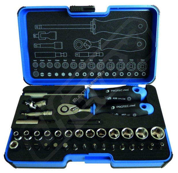 Sada je uložena do plastového boxu Obsah boxu: - Ergonomická ráčna ¼ " - Ergonomický šroubovák s ¼ " - Adapter ¼ " šestihran / čtverec x 50 mm - Prodloužení ¼" čtverec / čtverec x 50 mm - Držák E 6,3 ¼ "x 58 mm - Adaptér ¼" čtverec / šestihran x 25 mm - Nástrčné klíče ve velikostech 4.0 / 4,5 / 5,0 / 5,5 / 6,0 / 7,0 / 8,0 / 9,0 / 10 /11 / 12 / 13 / 14 - Bity 4,5 x 0,6 / 5,5 x 1,0 SW 4.0 / 5.0 / 6.0 Kříž PH 1 / PH 2 / PH 3 / PZ 1 / PZ 2 Torx: TR 10 / 15 / 20 / 25 / 30