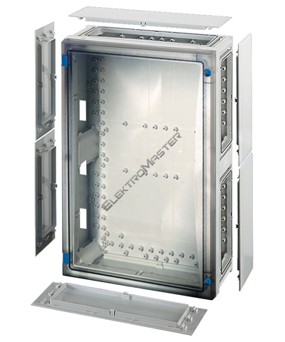 Variabilní systém skríní s dvermi pro výstavbu nízkonapetových rozvodných zarízení do 250 A jako typove zkoušený systém (TSK) dle IEC 60 439-1 pro montáž na stenu. Skríne jsou vhodné k montáži do venkovního prostredí, je treba respektovat klimatické vlivy a dopady na provozní prostredky. Spodní cásti skríne a dvere z polykarbonátu odolného proti nárazu, bez halogenu a silikonu, barva RAL 7035. Všechny skríne s dvermi, které lze uzamknout a zaplombovat. Ovládání zarízení se provádí z prostoru za dvermi. Požární odolnost v souladu s IEC 60 695-2-11 zkouška žhavicím drátem 960°C. Ochranné opatrení: S ochrannou izolací (trída ochrany II). Výrobek: Hensel ENYSTAR. Prázdná skrín s pruhlednými dvermi. Krytí: IP 65 dle IEC 60 529.