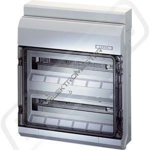 Instalacní rozvádec podle DIN EN 60670-24, DIN 43871 a IEC 61439-3, pro montáž prístroju s upevnením na DIN lištu do 63 A podle DIN43880, Ochrana izolací (Trída ochrany II). Urceno pro vnitrní prostredí a chránené venkovní prostredí podle DIN VDE 0100, díl 737. pro teplotu prostredí max. + 40 °C a min. - 5 °C, pri relativní vlhkosti vzduchu 50% pri 40 °C nebo 100% pri 25 °C. Tepelná odolnostmateriálu od - 25 °C do 70 °C Odolnost proti požáru podle VDE 0471, díl 2 -Zkouška žhavou smyckou 750 °C, UL Subject 94 V-2. Jmenovité napetí: AC 400 V. Materiál: Termoplast, bez halogenu a bez silikonu. Barva: šedá, RAL 7035 s pruhlednými dvermi pres všechny lišty. Výrobek: HENSEL KV. Krytí: IP 54 s integrovanými, elastickými tesnicími membránami 36 modulových jednotek a 18 mm