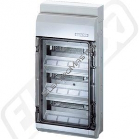 Instalacní rozvádec podle DIN EN 60670-24, DIN 43871 a IEC 61439-3, pro montáž prístroju s upevnením na DIN lištu do 63 A podle DIN43880, Ochrana izolací (Trída ochrany II). Urceno pro vnitrní prostredí a chránené venkovní prostredí podle DIN VDE 0100, díl 737. pro teplotu prostredí max. + 40 °C a min. - 5 °C, pri relativní vlhkosti vzduchu 50% pri 40 °C nebo 100% pri 25 °C. Tepelná odolnostmateriálu od - 25 °C do 70 °C Odolnost proti požáru podle VDE 0471, díl 2 -Zkouška žhavou smyckou 750 °C, UL Subject 94 V-2. Jmenovité napetí: AC 400 V. Materiál: Termoplast, bez halogenu a bez silikonu. Barva: šedá, RAL 7035 s pruhlednými dvermi pres všechny lišty. Výrobek: HENSEL KV. Krytí: IP 65 s integrovanými, elastickými tesnicími membránami 36 modulových jednotek a 18 mm