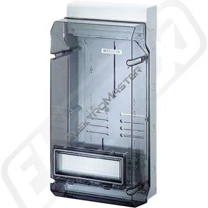 Elektromerová rozvodnice s elektromerovou nosnou deskou a elektromerovými upevnovacími šrouby (trída ochrany II). Vhodné do vnitrních prostor a pro chránenou instalaci ve venkovním prostoru podle DIN VDE 0100, cást 737. Pro teplotu prostredí maximálne + 40°C a minimálne -25°C, pri relativní vlhkosti vzduchu 50 % pri 40°C nebo 100 % pri 25°C Materiál, odolnost vuci teplote od -25°C do 70°C chování pri horení podle VDE 0471, cást 2 - zkouška žhavou smyckou 750°C. Materiál: termoplast, bez halogenu a silikonu Barva: šedá, RAL 7035 s pruhledným víkem, plombovatelným Výrobek: HENSEL KV s odklápecím okénkem pro 12 modulových jednotek a príslušnou nosnou lištou Krytí: IP 65 s integrovanými, elastickými tesnicími membránami