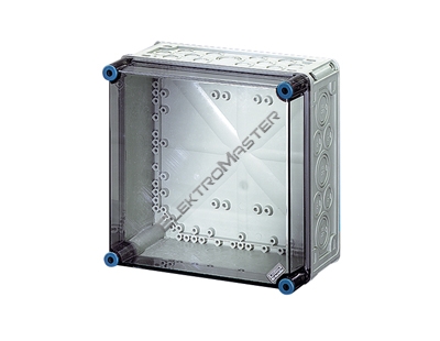 Nízkonapetový rozvádec zapouzdrený izolacním materiálem jako skrínový systém, "typove zkoušená kombinace rozvádecu" TSK podle IEC 60 439 -1 k montáži na stenu. Skríne musí být vhodné k montáži do venkovního prostredí, je treba respektovat klimatické vlivy a dopady na provozní prostredky. Spodní cásti a víko skríne z odolného polykarbonátu, bez halogenu a silikonu barva RAL 7032, víko pruhledné s rychlouzávery pro ovládání nástrojem. Požární odolnost podle DIN VDE 0471 cást 2 zkouška žhavou smyckou 960°C. Maximální absorpce vody 10 mg podle DIN 53473. Ochranné opatrení: S ochrannou izolací (trída ochrany II). Výrobek: HENSEL Mi-rozvadec. Prázdná rozvodnice s pruhledným víkem Krytí: IP 65 podle IEC 60 529
