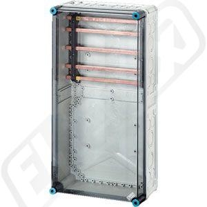 Nízkonapetový rozvádec zapouzdrený izolacním materiálem jako skrínový systém, "typove zkoušená kombinace rozvádecu" TSK podle IEC 60 439 -1 k montáži na stenu. Skríne musí být vhodné k montáži do venkovního prostredí, je treba respektovat klimatické vlivy a dopady na provozní prostredky. Spodní cásti a víko skríne z odolného polykarbonátu, bez halogenu a silikonu barva RAL 7032, víko pruhledné s rychlouzávery pro ovládání nástrojem. Požární odolnost podle DIN VDE 0471 cást 2 zkouška žhavou smyckou 960°C. Maximální absorpce vody 10 mg podle DIN 53473. Ochranné opatrení: S ochrannou izolací (trída ochrany II). Výrobek: HENSEL Mi-rozvadec. Prípojnicová skrín 5-pólová, N-vodic se stejnou schopností vést proud jako krajní vodic. Krytí: IP 65 podle DIN EN 60 529.