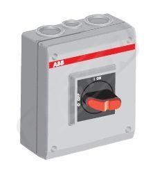 3-pólový odpínač v krytí IP65, plastový, šedý, žluto-červená rukojeť uzamykatelná třemi zámky s indikací 0-1 a OFF-ON, N-, PE- svorky