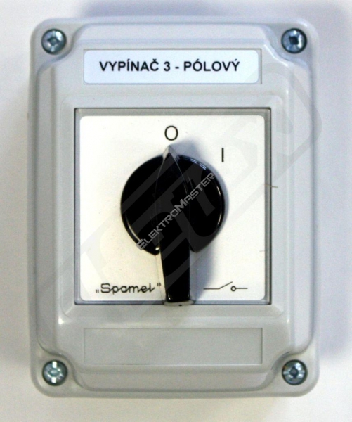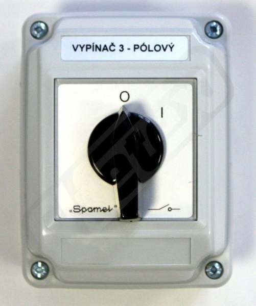 Spínač 0-1,40A, 3P, v plastovém krytu IP65 s ovládací páčkou. Součástí balení jsou 2 vývodky.