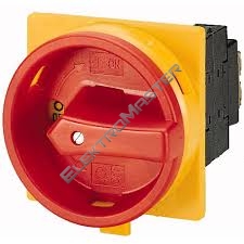 Hlavní spínač/vypínač podle IEC/EN 60947-3, 690 V, stupeň krytí vpředu IP65, rukojeť červená s blokovacím věncem žlutým, uzamykatelná s 3 visacími zámky oddělovací vylínače P5 jsou velmi kompaktní a robustně stavěné. Ruční pohon působí na kontakty v přímém spojení. Při vypnutí se kontakty nuceně otevřou.