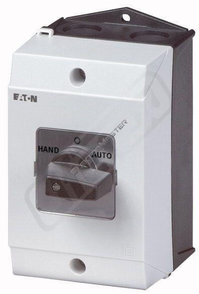 Vačkové spínače podle ČSN/EN60947, konstrukční velikost T3, ve skříňce pro povrchovou montáž, přední štítek ca. 48x48, stupeň krytíIP65, s černou rukojetí, jmenovitý trvalý proud Iu 32 A, jmenovité provozní napětí Ue 690V, příslušenství k dodání podle údajů v katalogu Vačkové spínače T