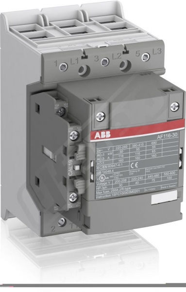 Stykač AF116-30-11-13, 3- pólový (3 ZAP), 116A, 55kW/400V(AC-3), ovládací napětí cívky: 100-250V 50/60Hz/DC, Klecová svorka, Pomocný kontakt: 1 ZAP a 1 VYP, rozměr: 90x126x150 mm