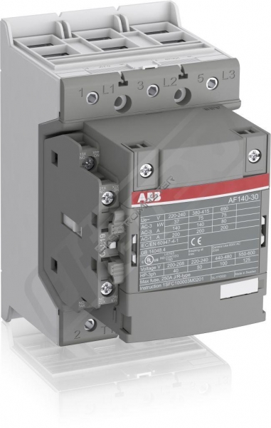 Stykač AF140-30-11-13, 3- pólový (3 ZAP), 140A, 75kW/400V(AC-3), ovládací napětí cívky: 100-250V 50/60Hz/DC, Klecová svorka, Pomocný kontakt: 1 ZAP a 1 VYP, rozměr: 90x126x150 mm