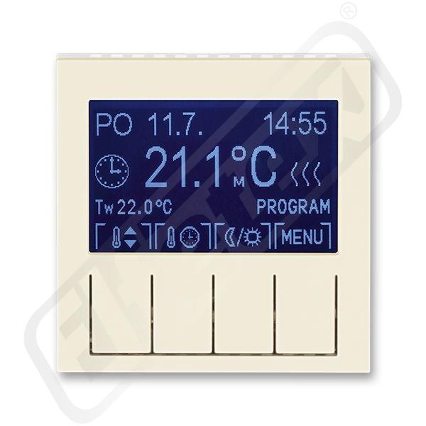 Levit# | Termostaty | Termostat univerzální programovatelný - ovládací část | slonová kost / bílá || Ovládací jednotka (nutno použít spínací přístroj). Volitelná funkce prostorového, podlahového nebo kombinovaného termostatu. Nastavitelné teploty: 0 °C až +50 °C.Provozní režimy: manuální, automatický (1 základní nebo 3 rozšířené časové programy), dovolená. Základní program: volba ze 2 přednastavených teplot - komfortní a útlumové. Rozšířený program: navíc možnost libovolně nastavitelné teploty. Časový program: max. 70 časových značek s rozlišením 5 minut, pro jednotlivé dny v týdnu nebo Po-Pá, So-Ne, Po-Ne. Další funkce: softwarové vypnutí, volba topení nebo chlazení, jas a kontrast displeje, zámek tlačítek, volba teplotního snímače, minimální a maximální limitní teplota, vnější ovládání kontaktem, adaptivní regulace, funkce předvídání, omezení nastavitelných teplot, počítadlo provozních hodin, protimrazová ochrana, ochrana ventilů, inverze funkce výstupu, automatický přechod zimní/letní čas, volba jazyka (CZ, EN, RUS). Rezerva chodu: cca90 dní (dobíjecí Li článek). Pracovní teplota: 0 °C až +50 °C. Snímač teploty pro podlahové vytápění: 3292U-A90100 (není v dodávce)