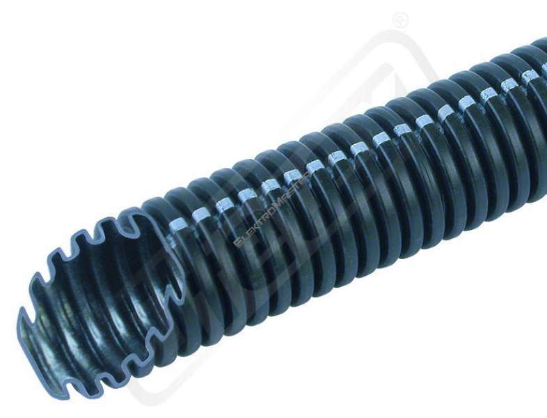 FFKU-EL-F-LS0H Low Smoke je lehce odolná plastová zvlnená trubka ze speciálního plastu, bez halogen?, nesírící plamen v barve cernéRAL 9005. Trubka je vhodná pro instalace pod omítku a do dutých prícek. VDE 0605 DIN EN 61386-22, 100% bez halogen? dle VDE 0604-2-100, hustota koure dle DIN EN 61034-2 minimální pevnost v tlaku: 320N/5cm, zatrídení: 23232