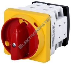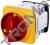 Přepínač 10A, uzamykatelný ovladač střední, žlutá deska, červená šipka, 0-1 45°