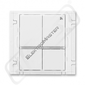 Element# | Bezdrátové radiofrekvenční (RF) ovládání | Vysílač RF signálu, nástěnný, čtyřtlačítkový | bílá / bílá || Při stisknutí jednotlivých částí hmatníku se vyšle odlišný kód (lze tak nezávisle ovládat dva nebo až čtyři přijímače). Napájení: Li baterie 3 V, typ CR 2430 (je součástí dodávky). Počet ovládaných kanálů: 4. Provozní kmitočet vysílače: 868 MHz. Dosah: až 150 m (ve volném prostoru). Automatické omezení doby vysílání: 60 s. Pracovní teplota: #20 °C až +55 °C. Vysílání a příp. pokles napájecího napětí jsou indikovány LE diodou.